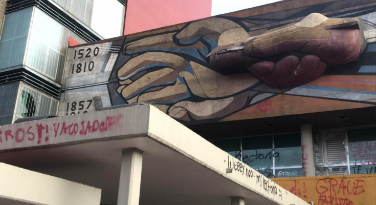 Luego del altercado que se suscitó en Ciudad Universitaria por grupos de choque, identificados como anarquistas, el mural del pintor David Alfaro Siqueiros ‘El derecho a la cultura’, ubicado en el costado norte de la Torre de Rectoría de la UNAM, resultó dañado con algunas pintas.