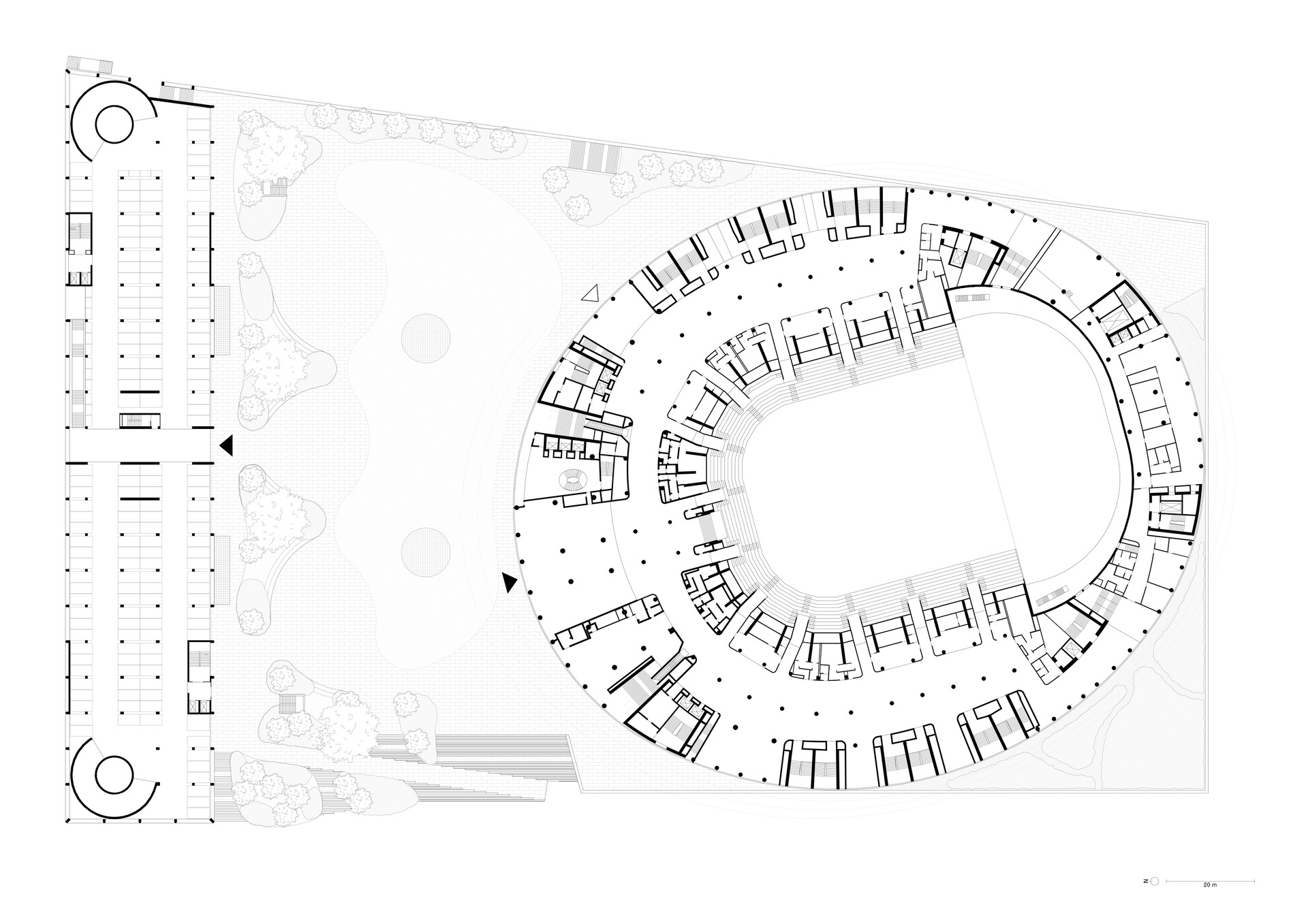 El edificio se eleva sobre un podio monumental de más de 10,000 metros cuadrados (m²), concebido como un espacio público abierto para eventos al aire libre y reuniones. Desde ahí, un amplio graderío interior con dos niveles superiores acoge las zonas de asientos, skyboxes y servicios para espectadores.