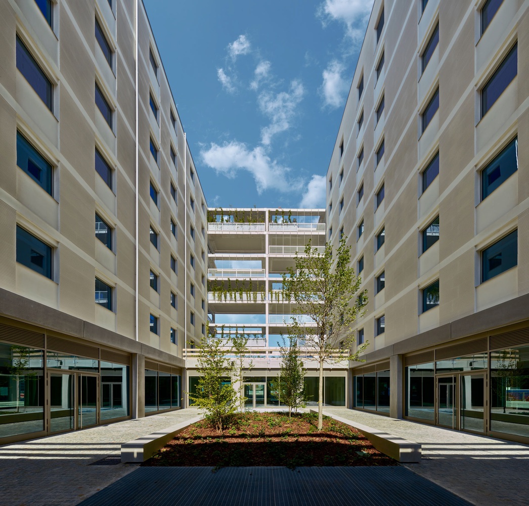 Además, los edificios nuevos se construyeron con madera maciza, las fachadas son prefabricadas y el diseño es modular, lo que contribuye a reducir las emisiones de carbono; y están diseñados para cumplir con los estándares de Edificios de Consumo de Energía Casi Nulo (NZEB) y cuentan con las certificaciones LEED Oro y WiredScore Platino.