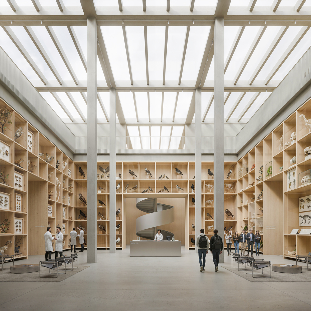 • Un atrio de triple altura, iluminado cenitalmente, diseñado como punto de encuentro para estudiantes, investigadores y visitantes, junto con salas de conferencias y áreas de exhibición seleccionada.