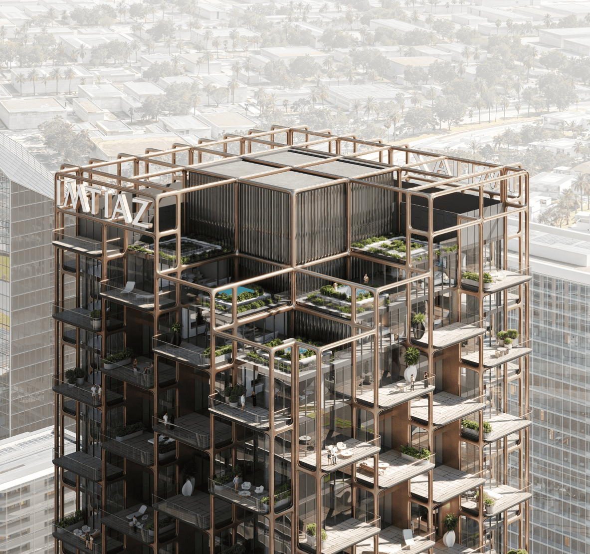 La torre también integrará paneles fotovoltaicos para alimentar la iluminación del edificio, además de que la energía solar acumulada permitirá que, tras el atardecer, el exoesqueleto emita un brillo ámbar suave que revela su patrón geométrico, evocando los reflejos metálicos del bordado Emiratí.