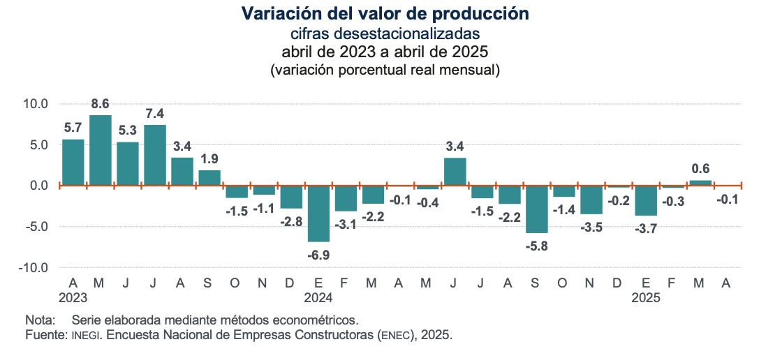 De acuerdo con la última Encuesta Nacional de Empresas Constructoras (ENEC), del Instituto Nacional de Estadística y Geografía (Inegi), al cierre de abril de 2025, el valor de la producción del sector construcción cayó 14.4% frente al mismo mes del año anterior.