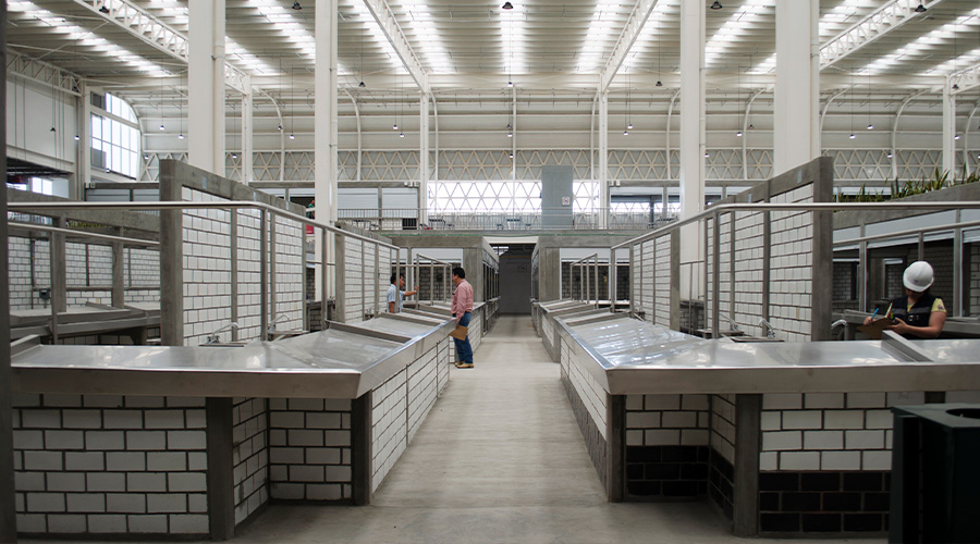 En este mercado emblemático se recurre al ladrillo para integrarse formalmente al entorno urbano y al patrimonio edificado. Su aplicación en muros y detalles constructivos refuerza la idea de continuidad con la ciudad existente, al mismo tiempo que ofrece resistencia estructural, facilidad de limpieza y mantenimiento, y una imagen más cálida para los usuarios.