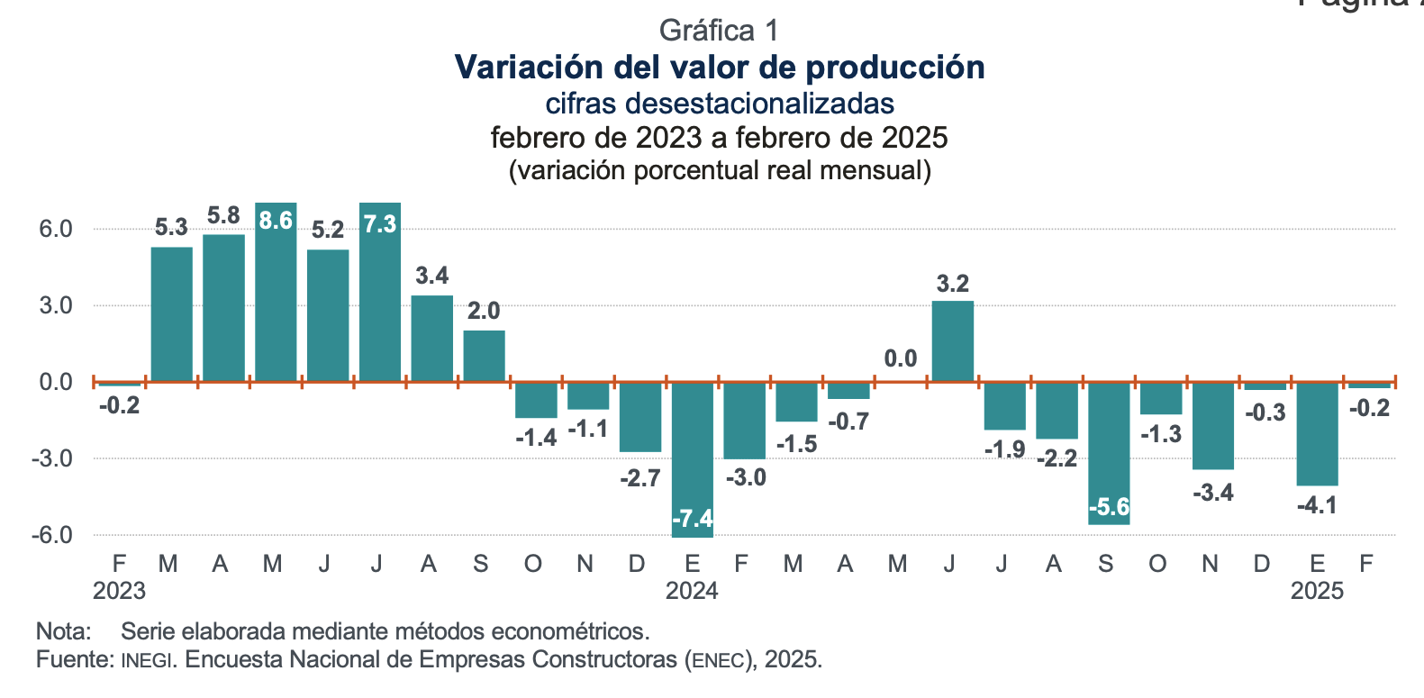 De acuerdo con la última Encuesta Nacional de Empresas Constructoras (ENEC), del Instituto Nacional de Estadística y Geografía (Inegi), al cierre de febrero de 2025, el valor de la producción del sector construcción cayó 0.2% en comparación con el mes inmediato anterior.
