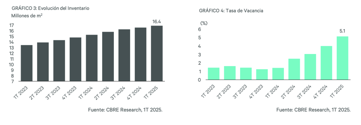 Con respecto al inventario, CBRE indicó que, al cierre del 1T2025 se reportaron 16.4 millones de m² de espacio existente, lo que representa un crecimiento anual del 10.9 por ciento.