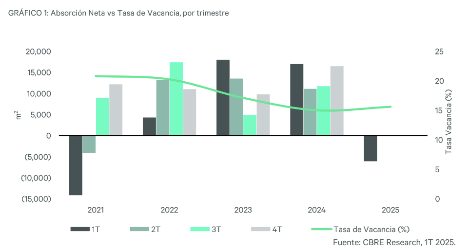 Por otro lado, CBRE destacó que la tasa de vacancia pausó su tendencia a la baja al registrarse un incremento en el inventario disponible en la ciudad. Este indicador cerró el 1T2025 en 15.6%, con más de 223,000 m² espacios de oficinas vacantes y en comercialización.