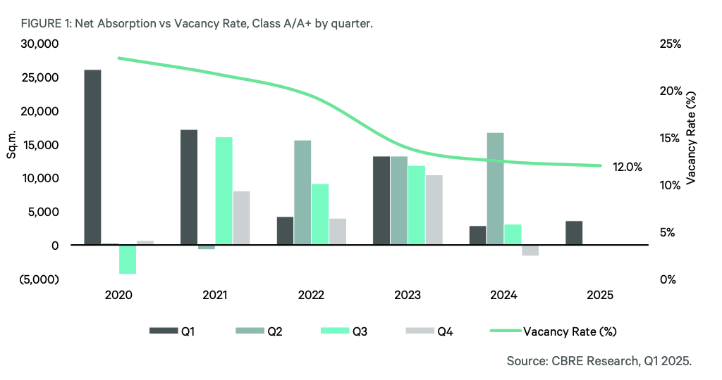 En tanto, la absorción neta registró más de 3,600 m² en el 1T2025, cifra que representó un incremento del 26% frente al mismo periodo de 2024 (2,900 m² de absorción neta).