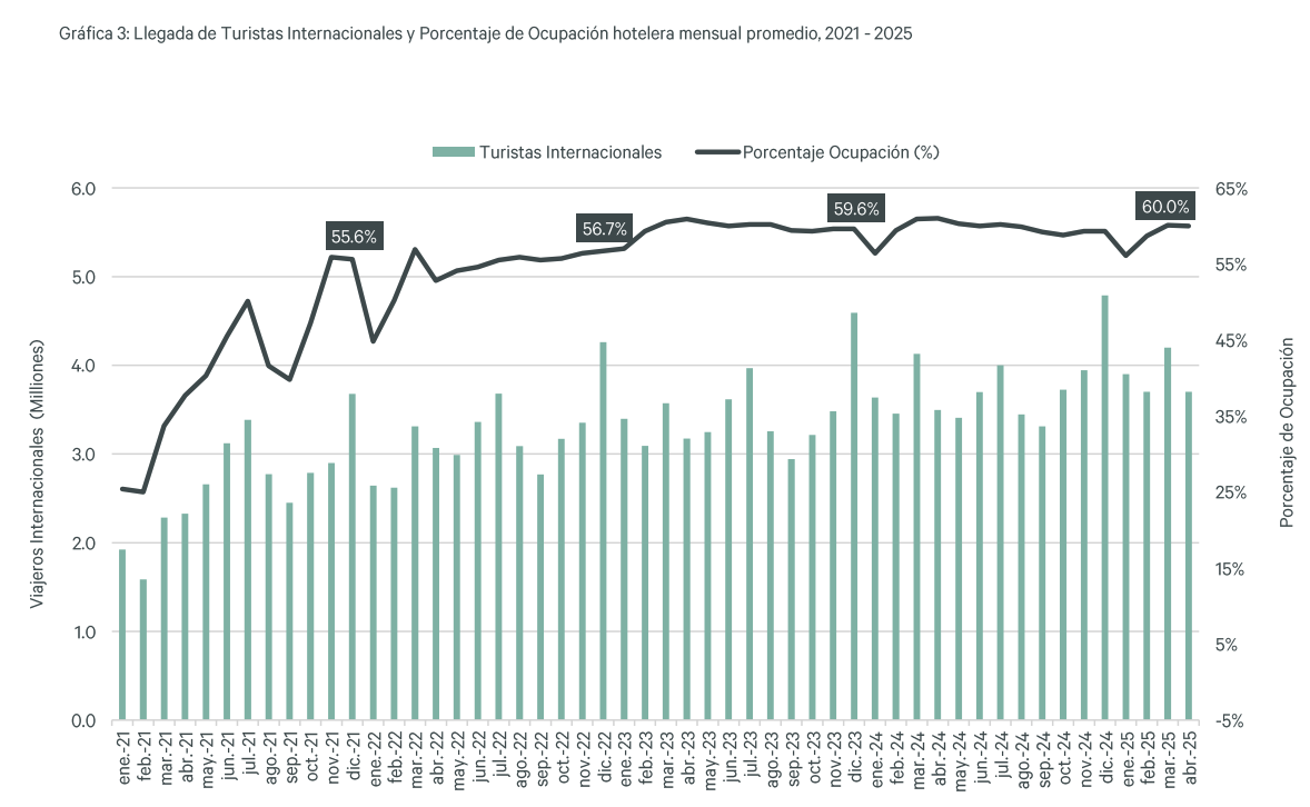 Al respecto, CBRE indicó que, en dicho periodo, México recibió un total de 15.6 millones de turistas internacionales, un aumento del 6% frente a 2024 y del 6.2% respecto a 2019. Entre los destinos de playa, Cancún y Los Cabos lideraron en llegadas internacionales por vía aérea, mientras que la Ciudad de México se mantuvo como el principal destino en los centros de negocios.