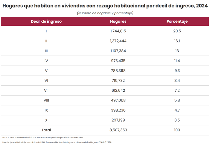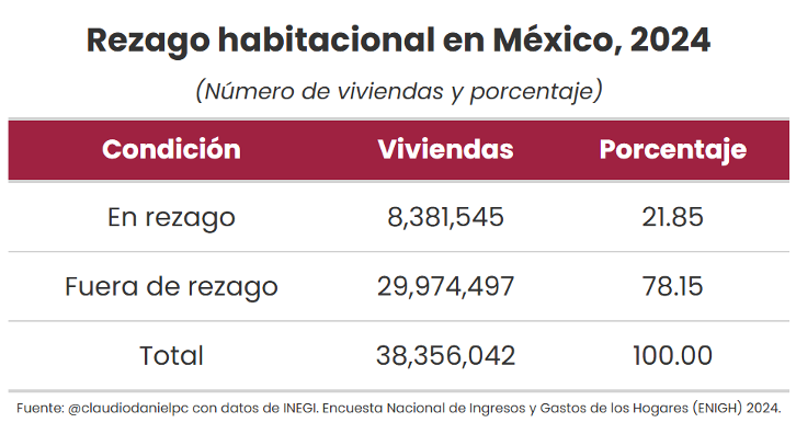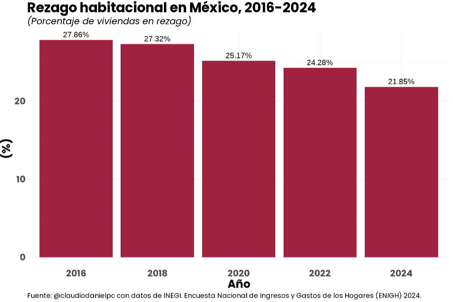 De acuerdo con la ENIGH 2024, 21.85% de las viviendas en México se encuentran en situación de rezago habitacional, lo que refleja una reducción de 2.43 puntos porcentuales frente al registrado en 2022.
