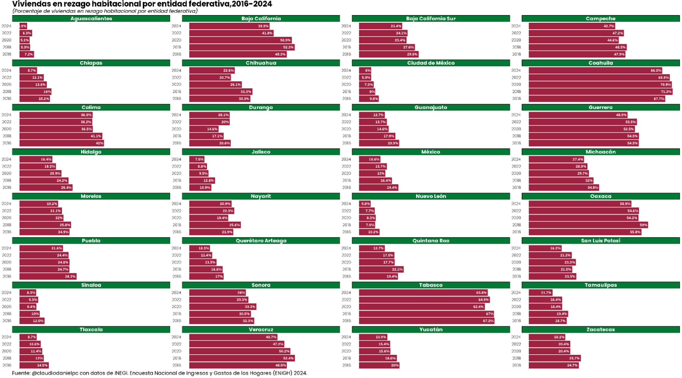 Algo que se debe destacar es que, en los últimos 8 años, la mayoría de las entidades han mostrado una disminución en el porcentaje de viviendas en rezago. Sin embargo, aún existen estados como Chiapas, Oaxaca, Coahuila, Tabasco, Veracruz, Guerrero, Baja California y Michoacán en donde la proporción se ha mantenido o la variación a la baja ha sido prácticamente nula o marginal.
