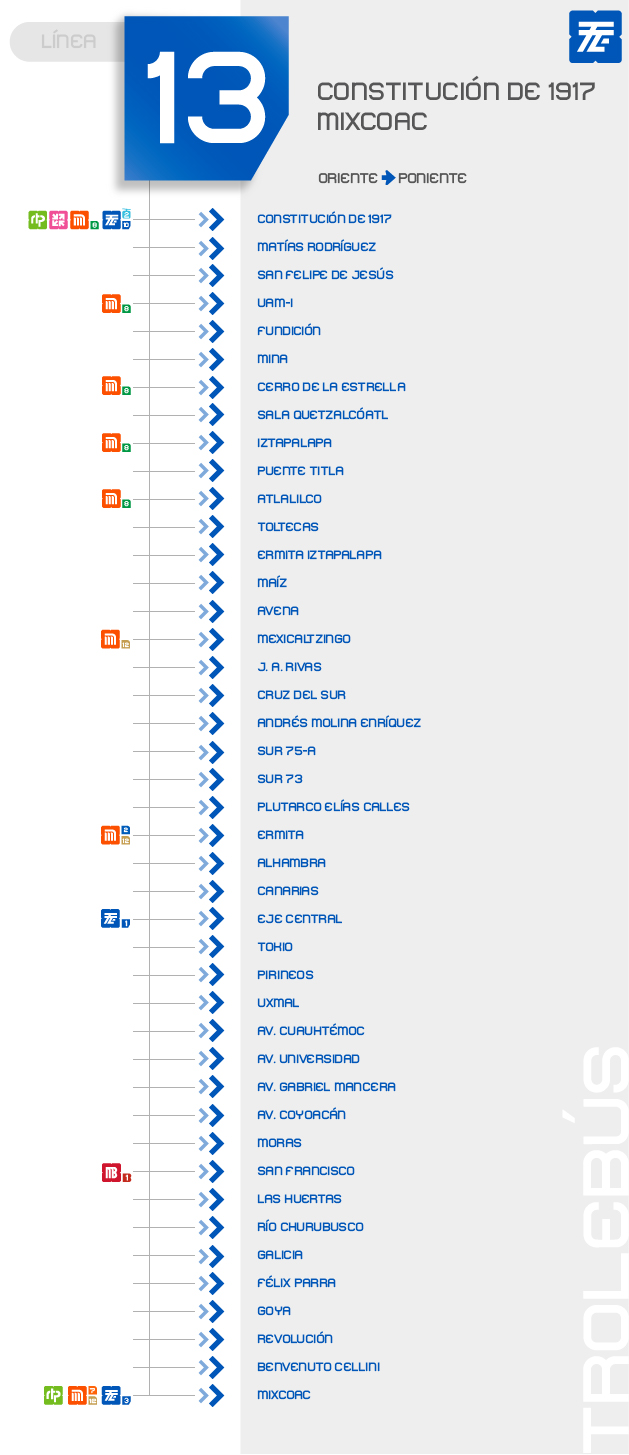 Y, de igual manera, la Línea 13 permitirá viajes intermodales por su conexión con las líneas 2, 7, 8 y 12 del STC Metro, la Línea 2 de Cablebús, las líneas 3 y 10 de la red de Trolebús, las Líneas 1 y 5 de Metrobús, rutas de la RTP y otros modos de transporte que operan en los Centros de Transferencia Modal en Constitución de 1917 y en Mixcoac.