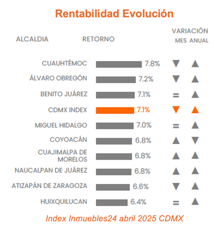 Con respecto a la CDMX, la ciudad en la que hay mejor ROI, destaca el hecho de que entre las alcaldías la Cuauhtémoc tiene el mayor porcentaje con 7.8%, seguida por Álvaro Obregón y Benito Juárez con 7.2 y 7.1%, respectivamente.