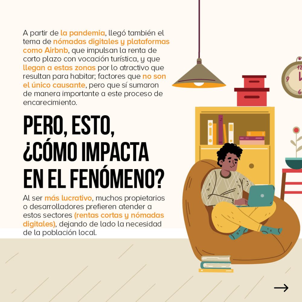 - Al ser más lucrativo, muchos propietarios o desarrolladores prefieren atender a estos sectores (rentas cortas y nómadas digitales), dejando de lado la necesidad de la población local.