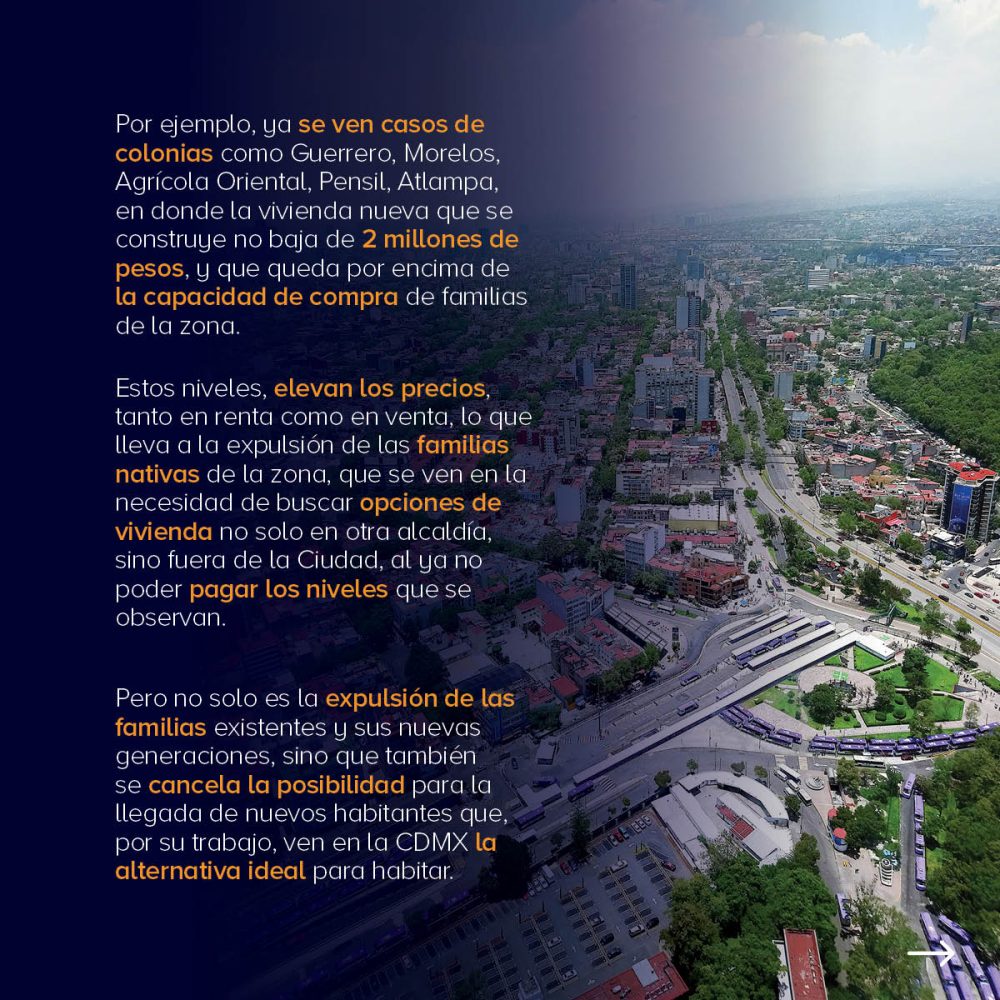 Por ejemplo, ya se ven casos de colonias como Guerrero, Morelos, Agrícola Oriental, Pensil o Atlampa, en donde la vivienda nueva que se construye no baja de 2 millones de pesos, y que queda por encima de la capacidad de compra de familias de la zona.