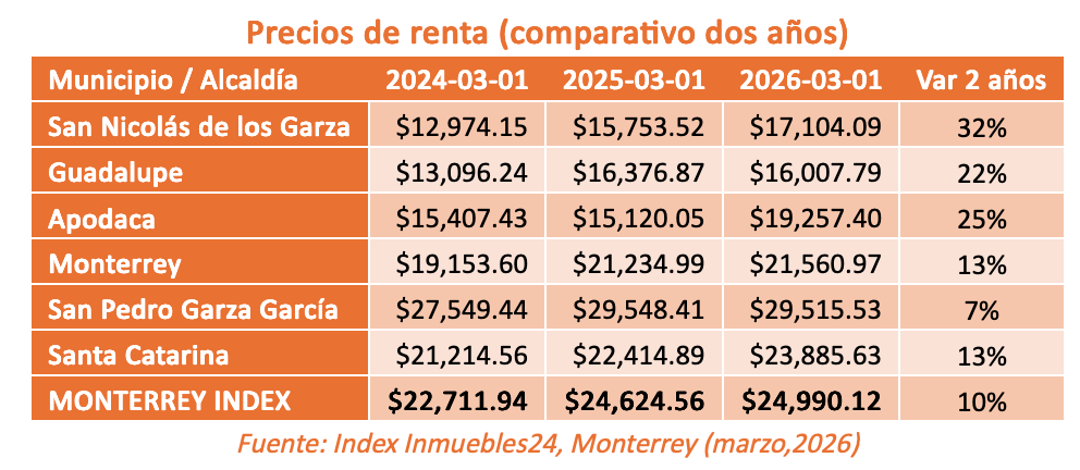 De acuerdo con datos del Index mensual de Inmuebles24, San Nicolás de los Garza fue el municipio que presentó el mayor aumento en rentas entre marzo de 2024 y marzo de 2026, al pasar de 12,974 pesos a 17,104 pesos mensuales, lo que representa una variación de 32 por ciento.