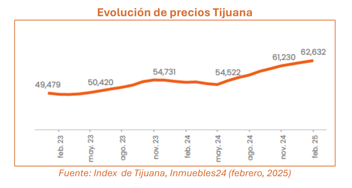 De acuerdo con el index más reciente de Inmuebles24, al cierre de febrero de 2025, el precio medio de la vivienda en la ciudad de Tijuana, Baja California, se ubicó en 62,632 pesos por metro cuadrado (m²), lo cual representa un alza de 22% frente a lo reportado en el mismo mes de 2023.