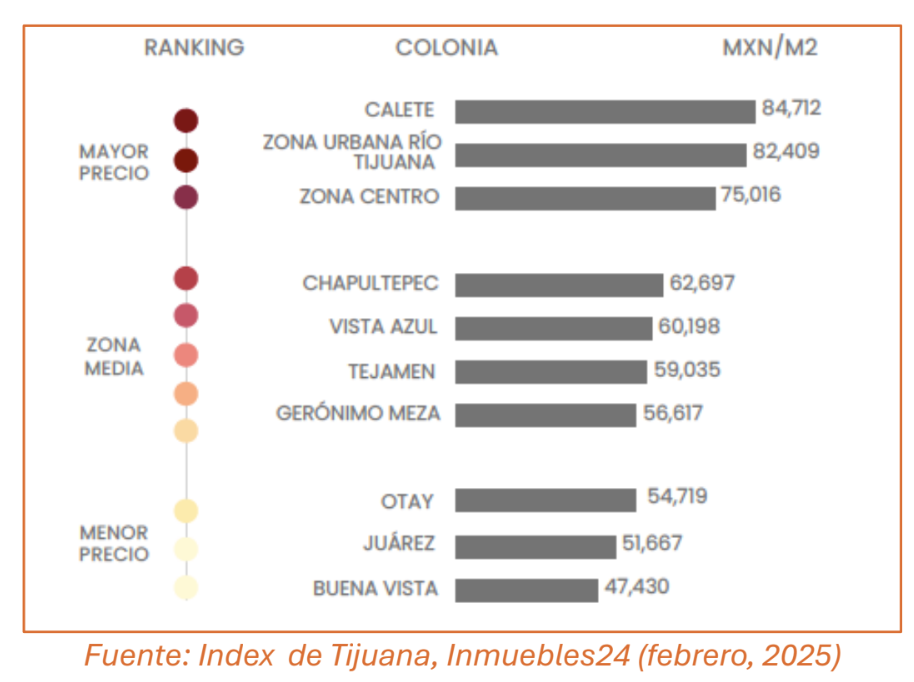 Por otra parte, las colonias tijuanenses con precios más económicos son Otay, Juárez y Buena Vista, en donde el metro cuadrado puede encontrarse entre 47,000 y 54,719 pesos.