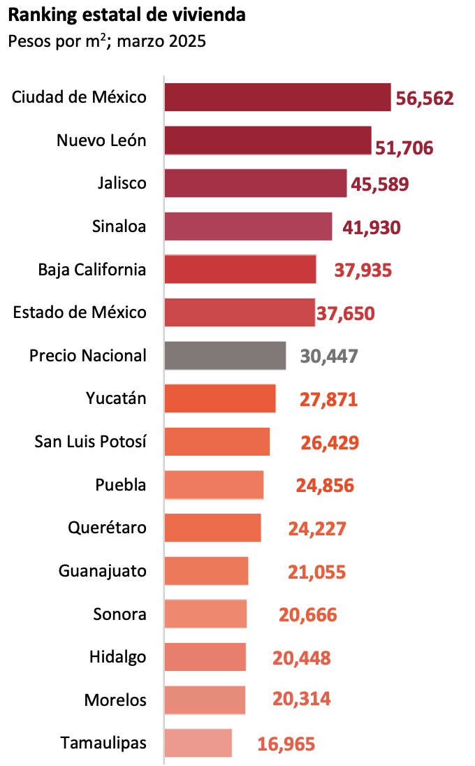 En primer lugar, la CDMX, con 56,562 pesos por m², 3.2% más que en 2024; seguida por Nuevo León, con 51,706 pesos por m², un aumento de 3% frente al 2024; y Jalisco, con 45,589 pesos por m² y un aumento de 0.9 por ciento.