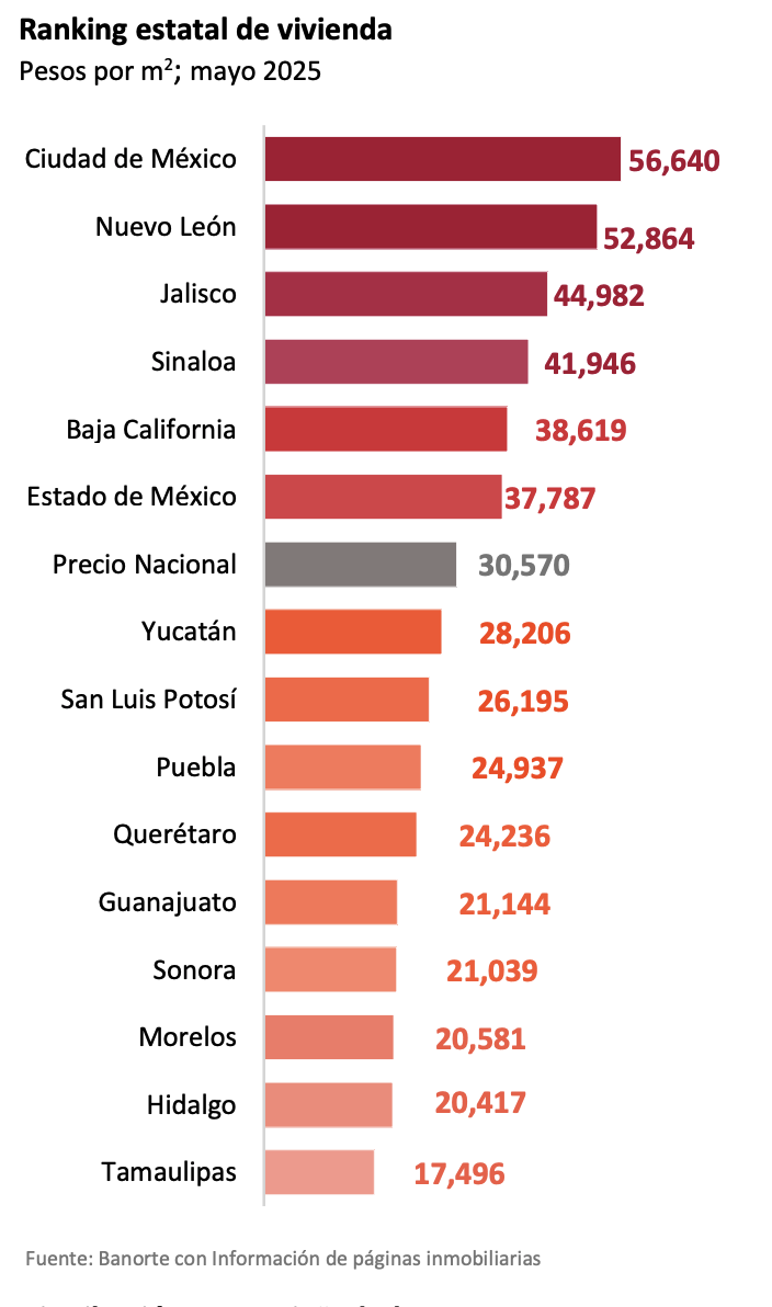 De acuerdo con el Indicador Banorte de Precios de Vivienda (Inbaprevi), al cierre del mes de mayo de 2025, el precio promedio de la vivienda a nivel nacional se ubicó en 30,570 pesos por metro cuadrado (m²).