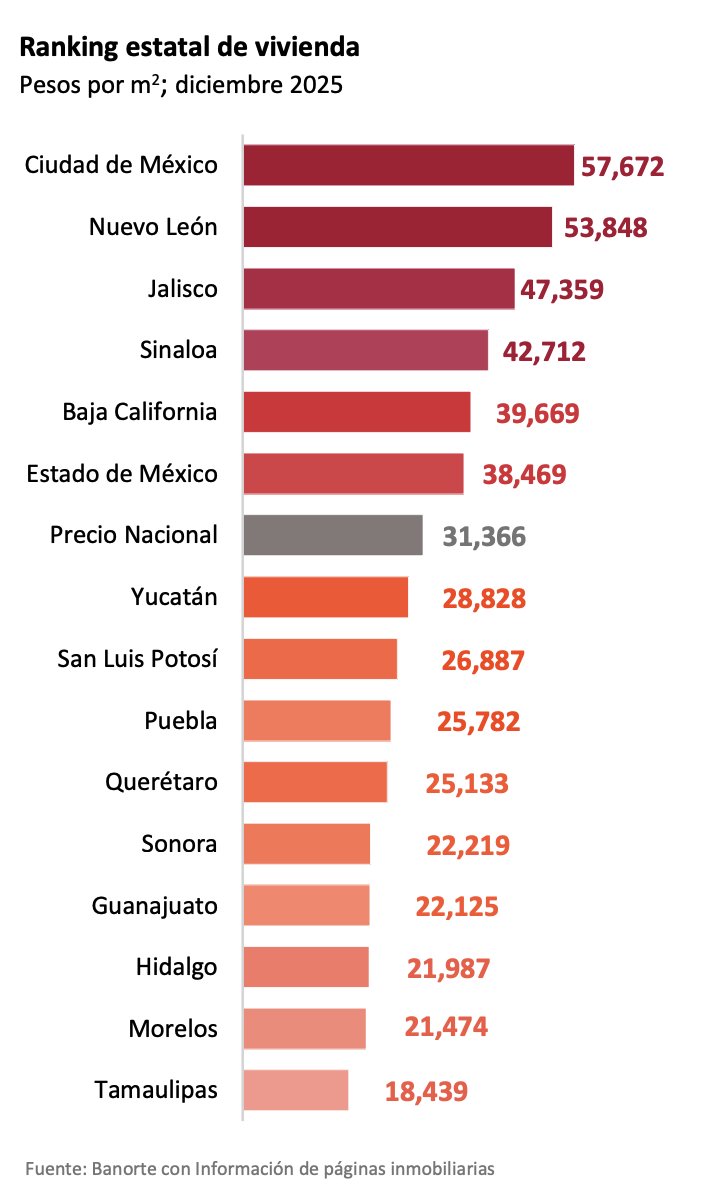 Asimismo, el análisis de Banorte, que incluye información de 15 entidades federativas, colocó a la Ciudad de México como el mercado con el precio promedio más alto, al registrar 57,672 pesos por m² en diciembre.