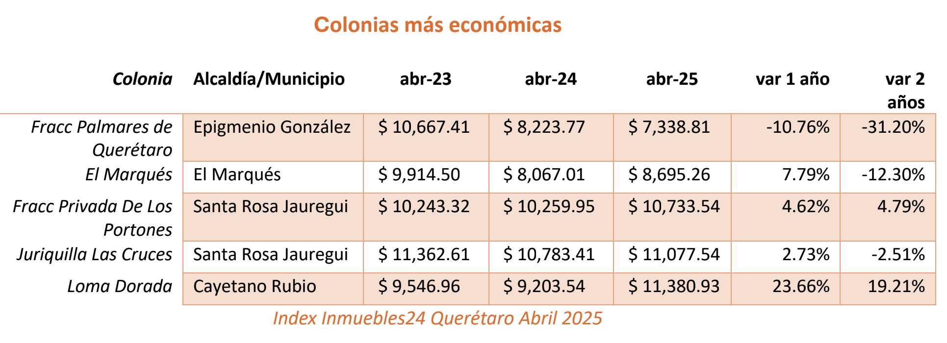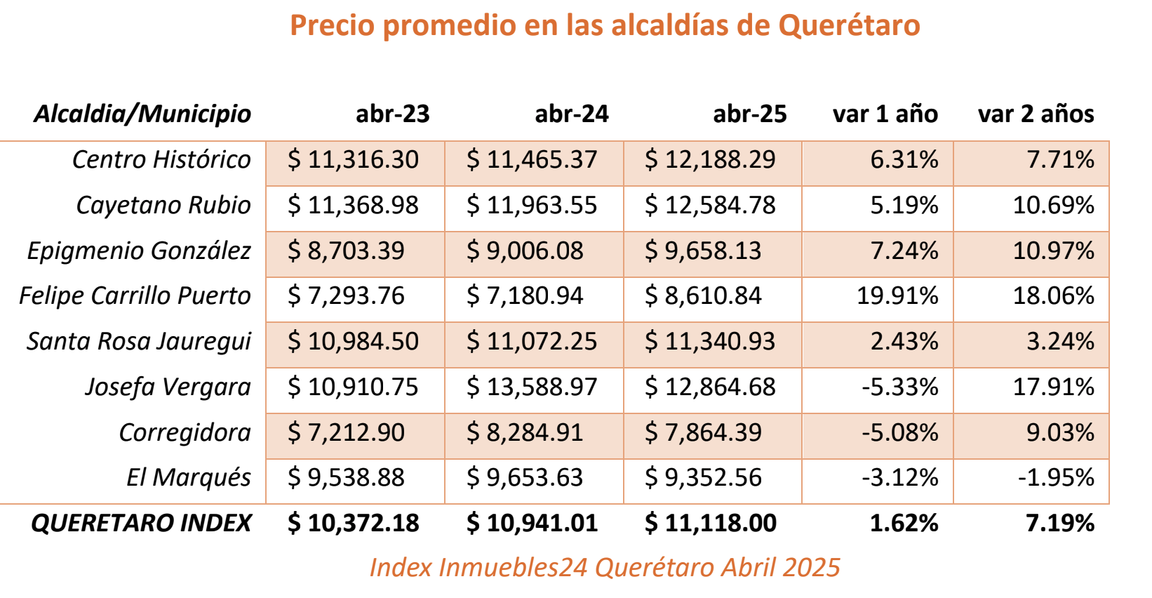 Con respecto a los municipios queretanos, Inmuebles24 destacó que, al mes de abril de 2025, Felipe Carrillo Puerto reportó un crecimiento del 19.91% anual, mientras que zonas como Cayetano Rubio y Epigmenio González también mostraron alzas relevantes. En contraste, Josefa Vergara, Corregidora y El Marqués registraron caídas anuales en el precio promedio de renta.