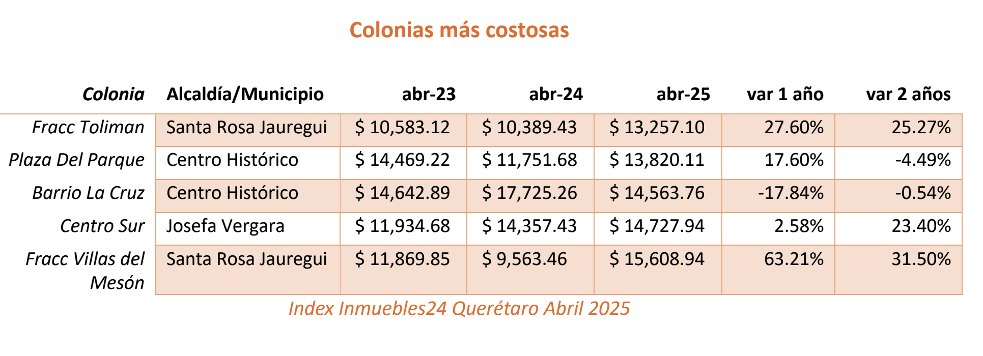 Por su parte, las colonias más costosas son: