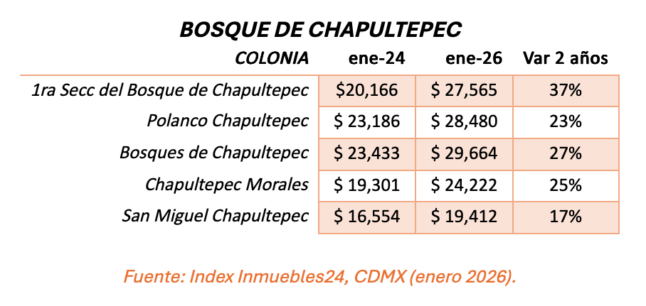 En tanto, colonias como Polanco Chapultepec, Bosques de Chapultepec y Chapultepec Morales también registraron aumentos superiores al 20 por ciento.