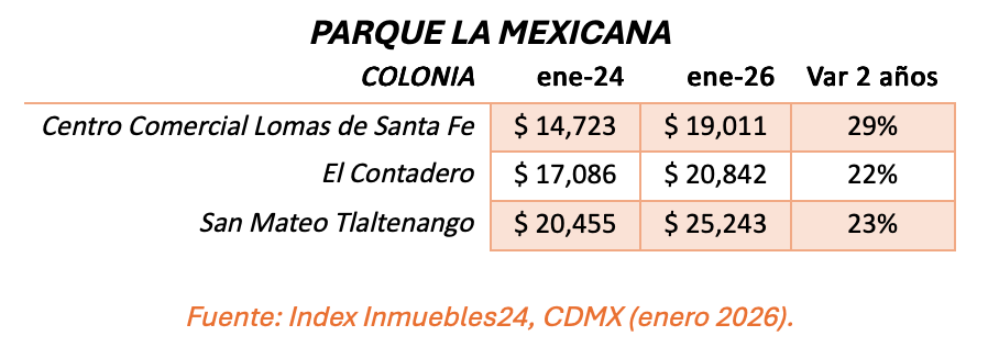 Por otro lado, en el poniente de la ciudad, las colonias cercanas al Parque La Mexicana, uno de los desarrollos urbanos más modernos, han experimentado incrementos de entre 22% y 29 por ciento.