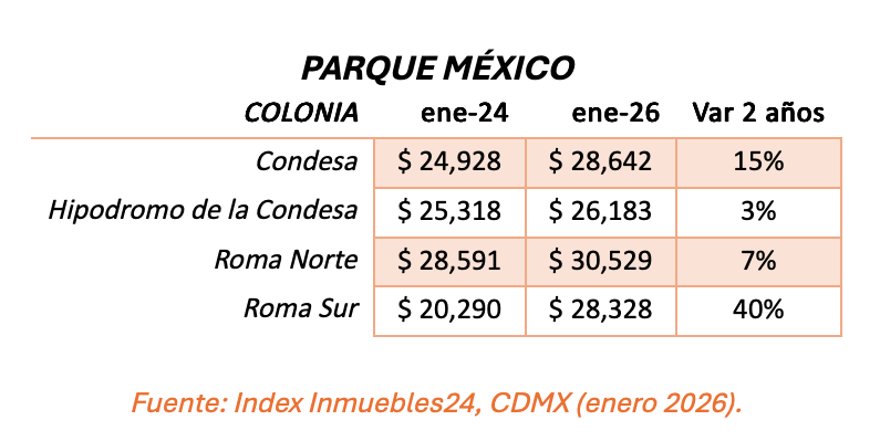 El entorno del Parque México, en la Condesa, muestra uno de los comportamientos más contrastantes, pues, mientras algunas colonias presentan incrementos moderados, otras registran alzas aceleradas.