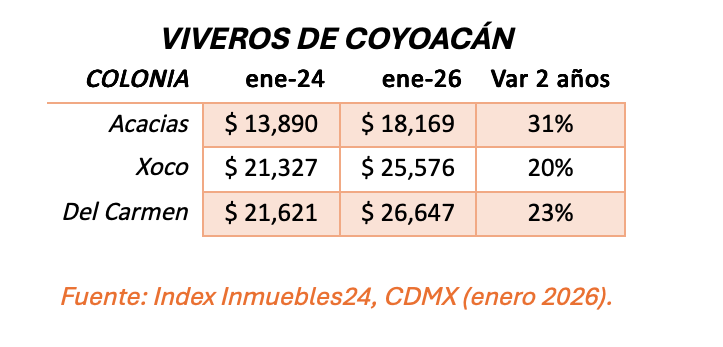 Finalmente, en los alrededores de los Viveros de Coyoacán, las rentas han crecido por encima del 20% en los últimos dos años.