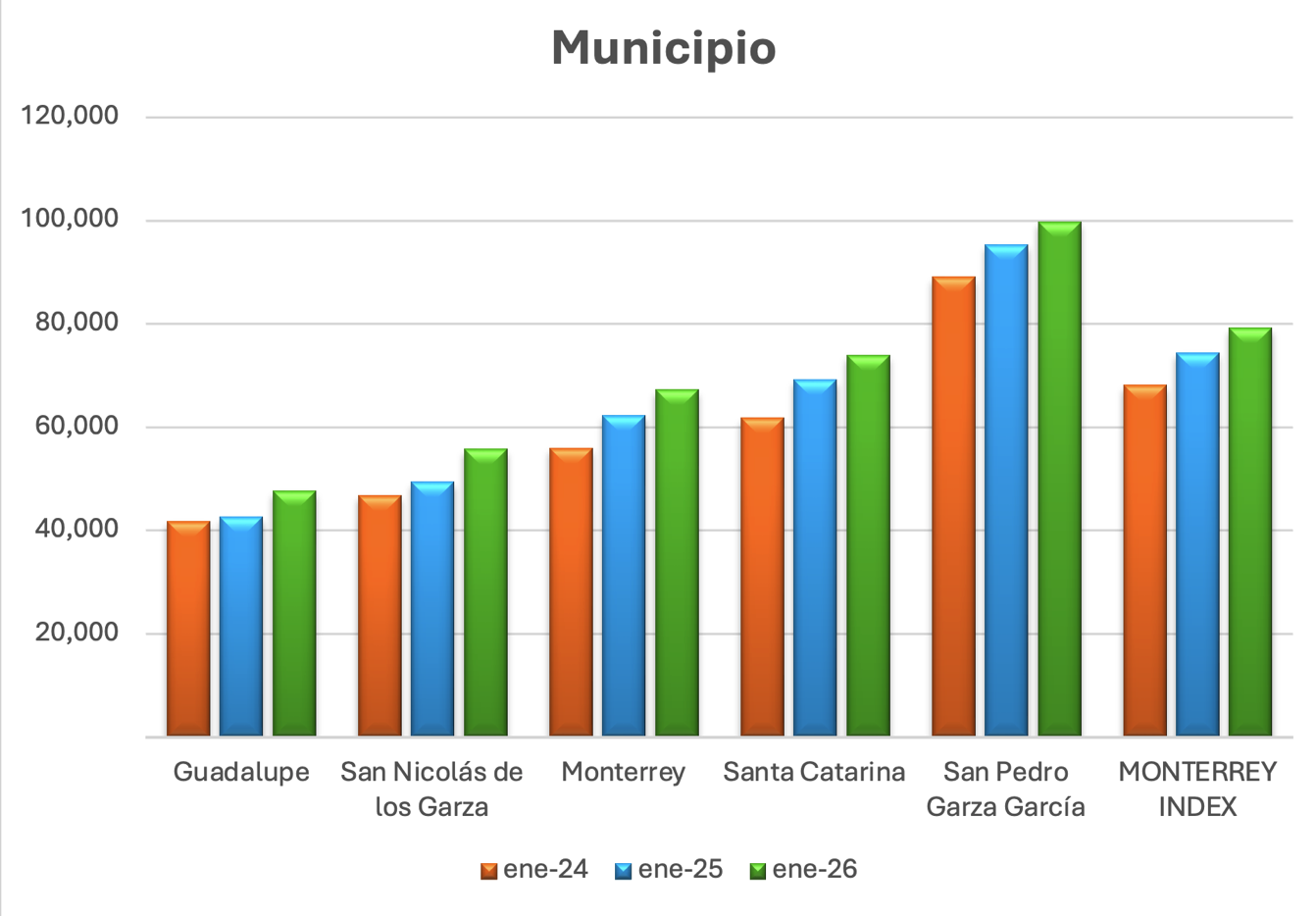De acuerdo con el Index Inmuebles24 Monterrey (enero 2026), cinco municipios de la Zona Metropolitana registraron aumentos en el precio por m² que van del 14% al 20% en el periodo analizado.