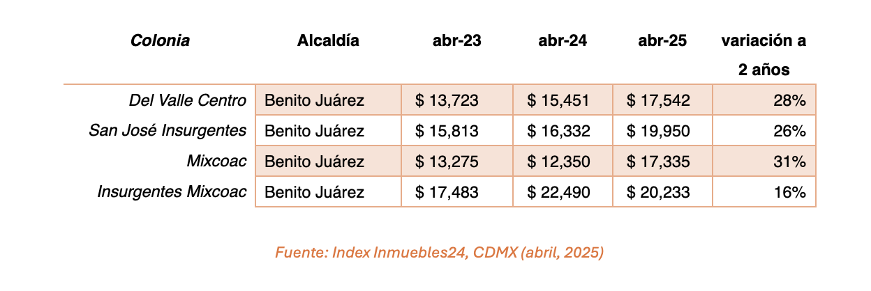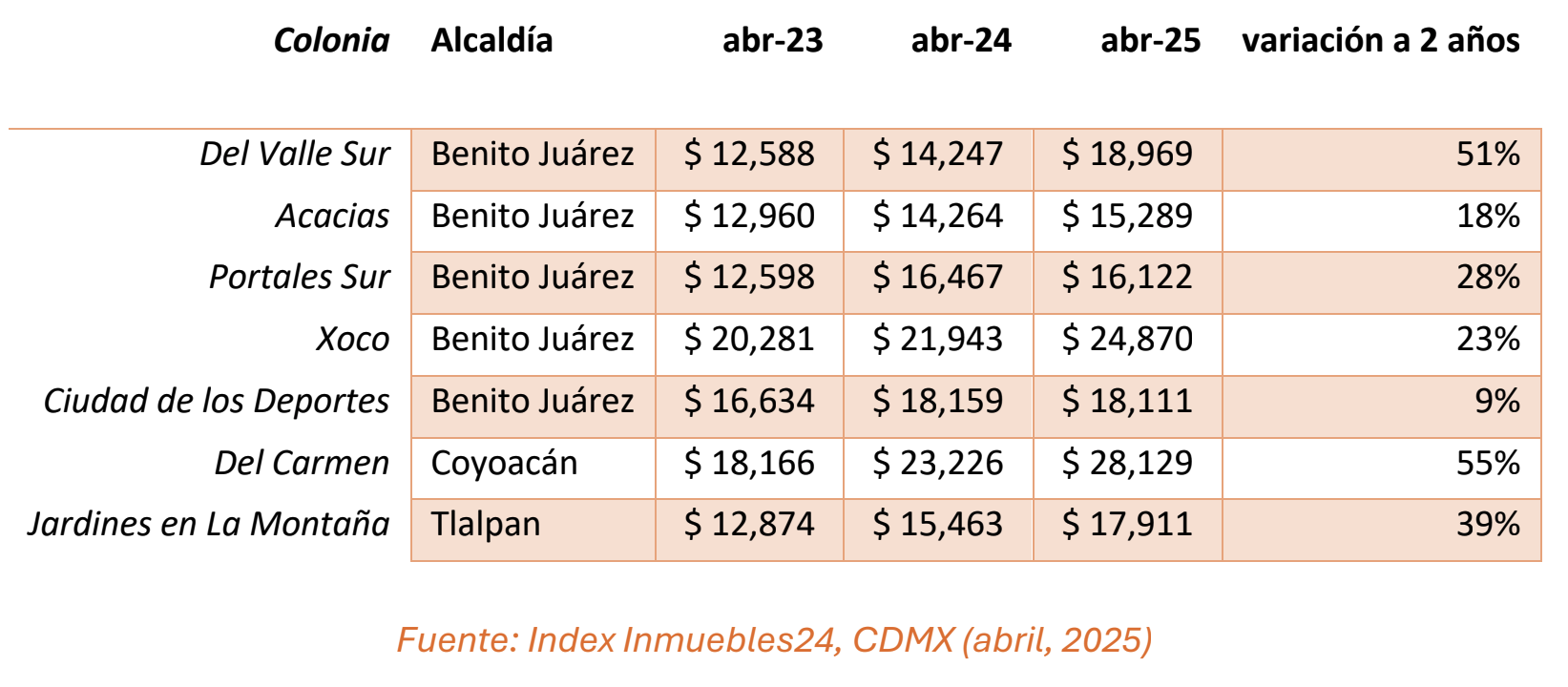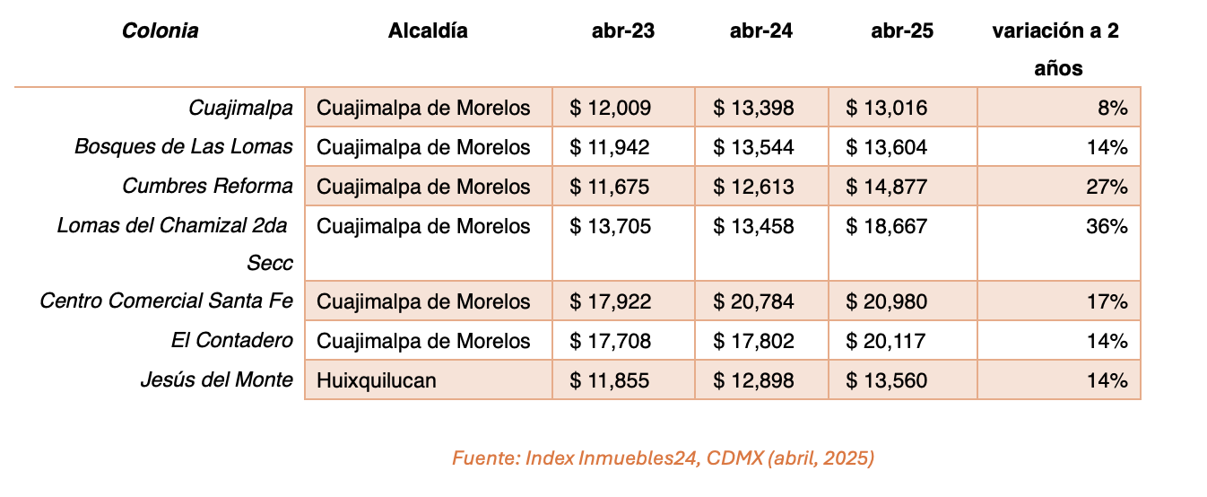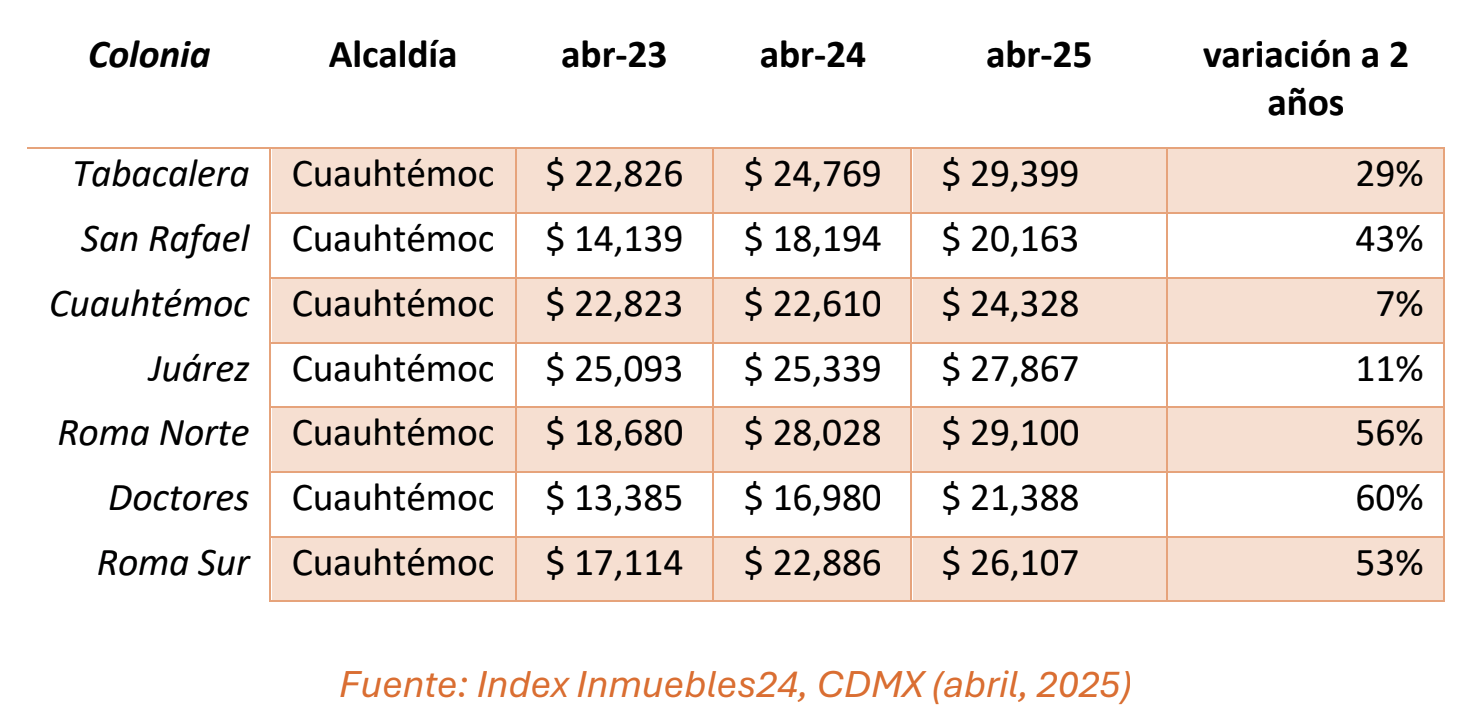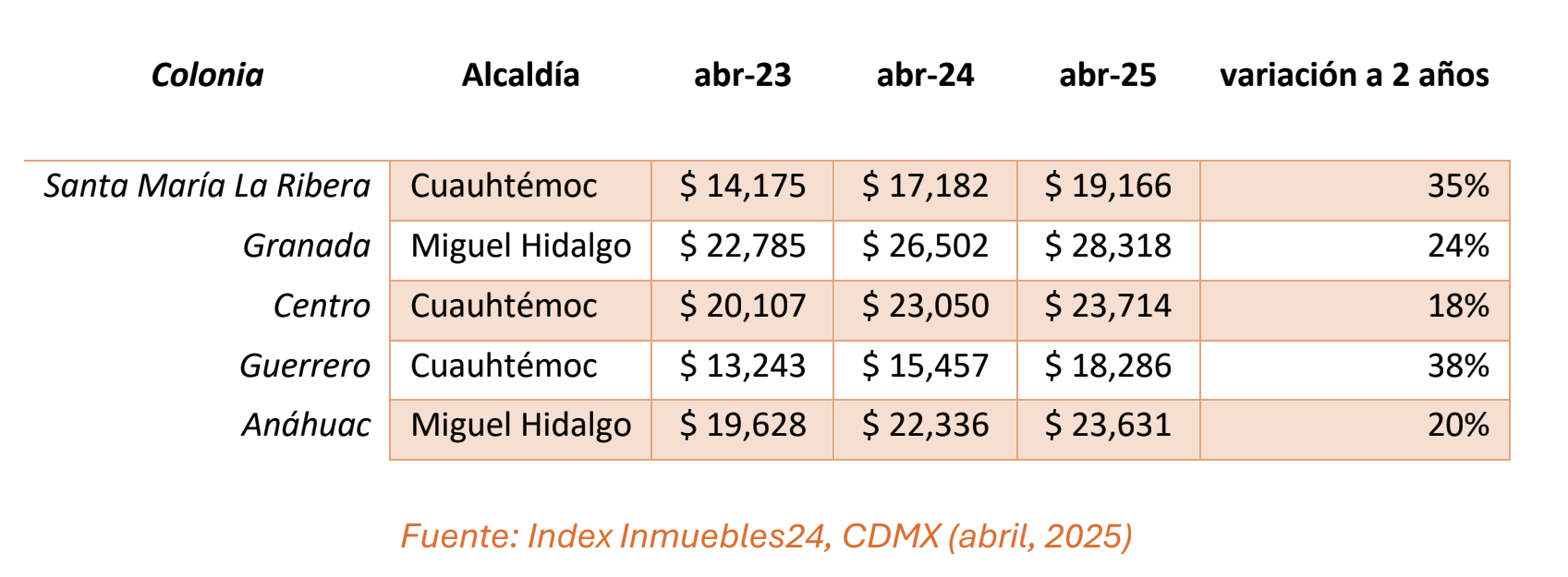 Los precios más elevados se encuentran cerca de la Universidad del Valle de México campus San Rafael, donde las rentas alcanzan los 30,000 pesos